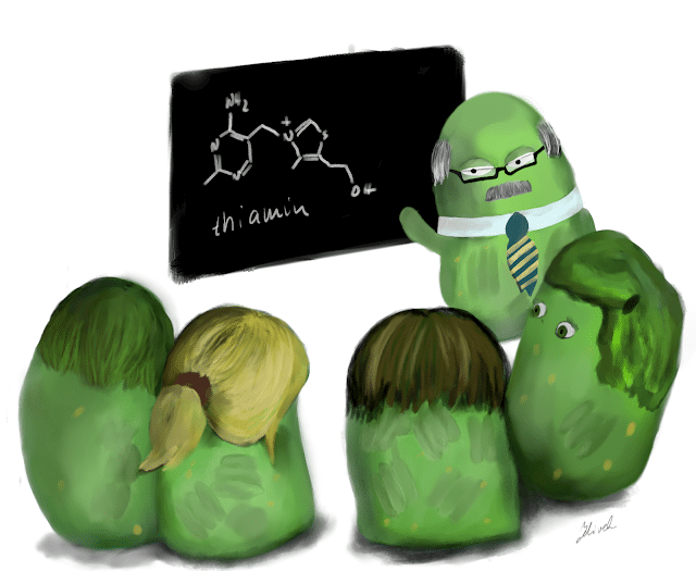 Thiamin je derivátem dvou heterocyklů : pyrimidinu a thiazolu, které jsou oba spojeny methylenovou skupinou (-CH2)- a v roztoku jsou poměrně nestabilní. Jedná se o prekurzor kofaktorů, které umí přenášet fosfátové zbytky (ATP, GDP) nebo uhlíkaté fragmenty (thiamindefosfát – oxidační dekarboxylace). Tedy kofaktor transferáz. Že jste zase ztraceni?