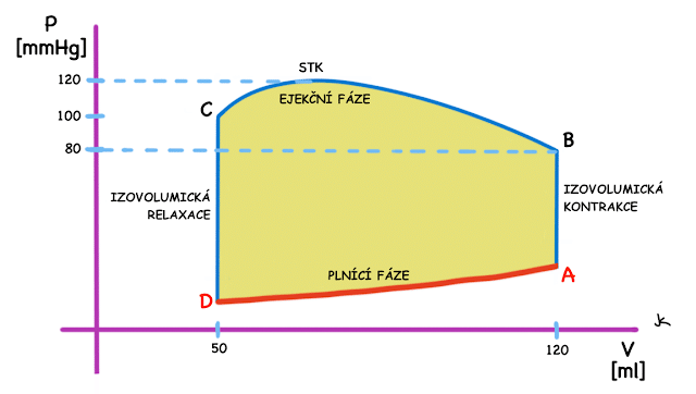 Srdce pracuje v několika mechanických fázích, které se opakují pořád dokola. Je to plnicí fáze (D-A), izovolumická kontrakce (A-B), ejekční fáze (B-C) a izovolumická relaxace (C-D).